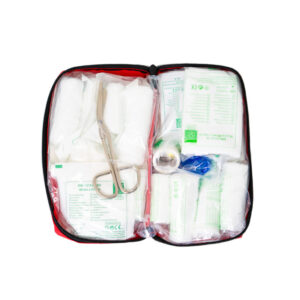 Zestaw przenośny pierwszej pomocy wykonany z tkaniny wodoodpornej, zapinany na zamek błyskawiczny. Posiada pasek do noszenia. Wyposażenie – 2 x DIN 13164 aparat do sztucznego oddychania, wyposażenie zgodne z normami UE. Wymiary: 340 mm x 170 mm x 80 mm