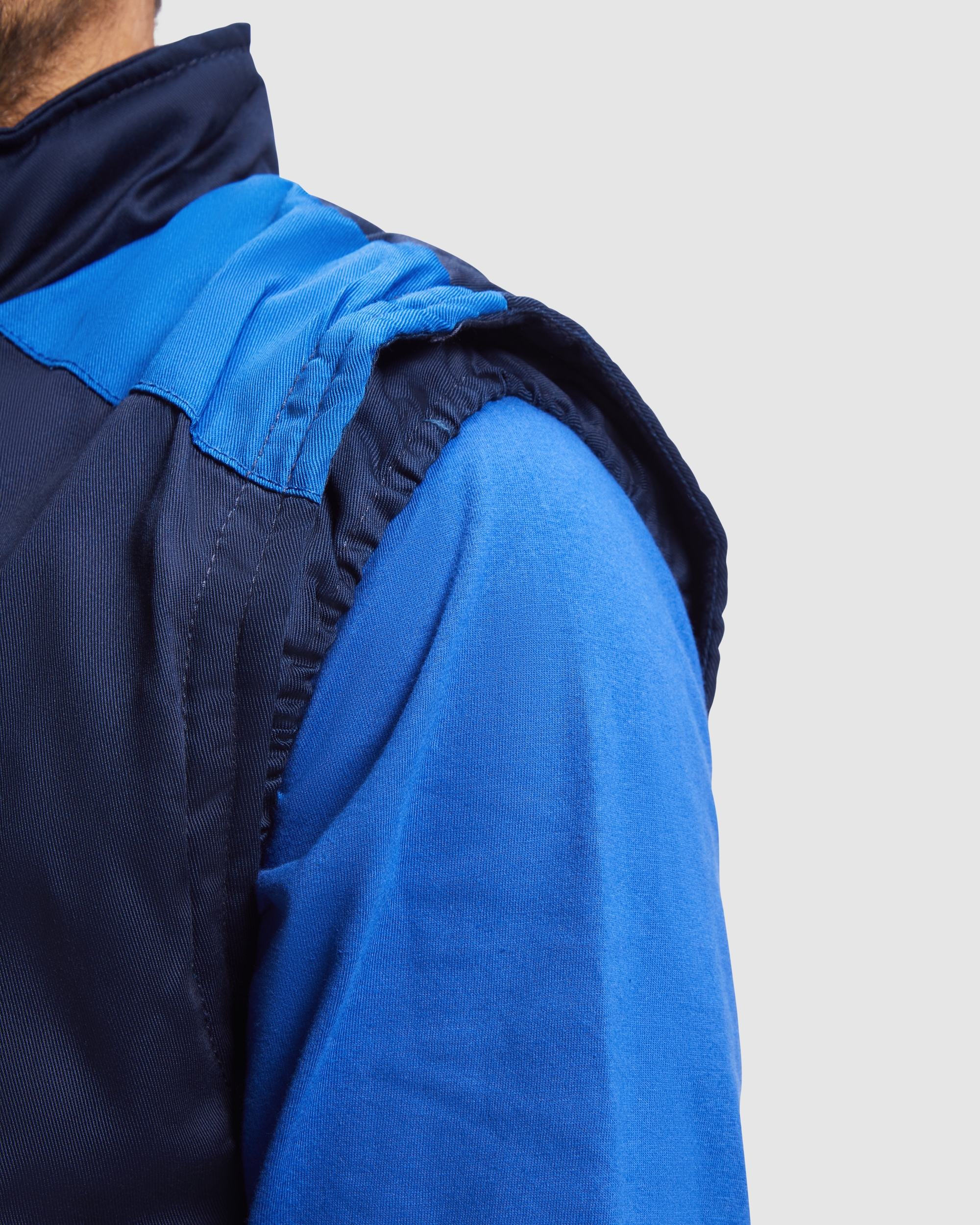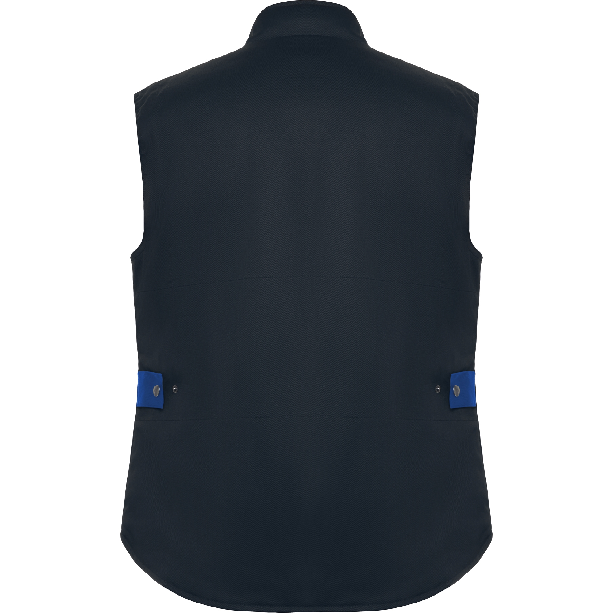 Wielokolorowa kamizelka robocza z wieloma kieszeniami z wysokim kołnierzem.