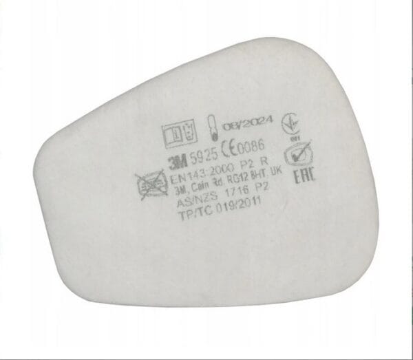 Filtr 3M 5925 P2R chroni przed cząstkami substancji ciekłych i stałych. Pasują do półmasek i masek pełnych 3M serii 6000 oraz 7000. Chroni przed cząstkami substancji ciekłych i stałych, pyłami, parą wodną i mgłą olejową. Mocowanie bagnetowe umożliwia precyzyjnie i bezpiecznie podłączenie go do masek i półmasek. Posiada klasę ochrony P2R. Znajduje różnorakie zastosowanie – w rolnictwie, budownictwie, stolarstwie, przy obróbce kamienia i ceramiki, pracy ze sproszkowanymi substancjami chemicznymi, przemyśle farmaceutycznym, itp. Posiada zgodność z normą EN 143.