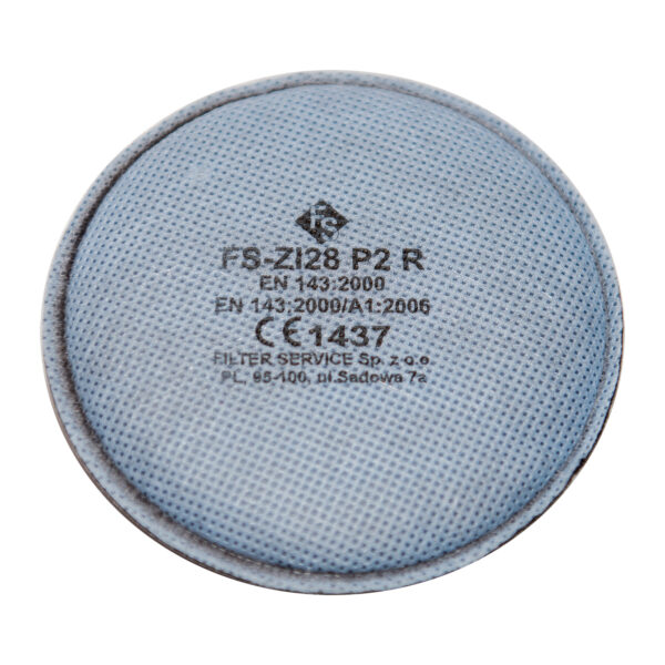 Filtry posiadają warstwę specjalnej włókniny z węglem aktywnym. Dzięki niej mogą być stosowane w środowiskach, gdzie występują nieprzyjemne zapachy. Zastosowanie: Zamiennik dla produktu 3M 2128 Przeznaczone są do ochrony układu oddechowego – po skompletowaniu z półmaskami 3M serii 6000 i 7500 – przed aerozolami z cząstek stałych lub aerozolami na bazie wody (pył, dym) oraz aerozolami z ciekłą fazą rozproszoną (mgły), o ile stężenie fazy rozproszonej aerozolu nie przekracza 12 x NDS. Dodatkowo filtry FS-ZI28 P2 R dzięki zastosowanej w nich warstwie sorpcyjnej zawierającej węgiel aktywny są przeznaczone do ochrony układu oddechowego przed parami organicznymi poniżej NDS. Dodatkowe zalety: Mocowane do części twarzowej za pomocą systemu bagnetowego. Można je łączyć z pochłaniaczami 3M serii 6000 stosując łącznik 3M-502. Zapewniają skuteczność filtracji na poziomie minimum 94%. Są lekkie i zapewniają wysoki komfort użytkowania. Skład: Konstrukcja filtra: – Igłowana włóknina poliestrowa – Włóknina polipropylenowa typu melt blown – Włóknina z węgla aktywnego – Włóknina osłonowa Elementy dodatkowe: – Złącze bagnetowe Kategoria: Filtry przeciwpyłowe Klasa: P2 NDS: 12 x NDS Norma: EN 143:2000 ; EN 143:2000/A1:2006 Certyfikat: wydany przez CIOP PIB zgodny z UE 2016/425 Spełniają wymagania Rozporządzenia Parlamentu Europejskiego i Rady (UE) 2016/425 z dnia 9 marca 2016 w sprawie środków ochrony indywidualnej.