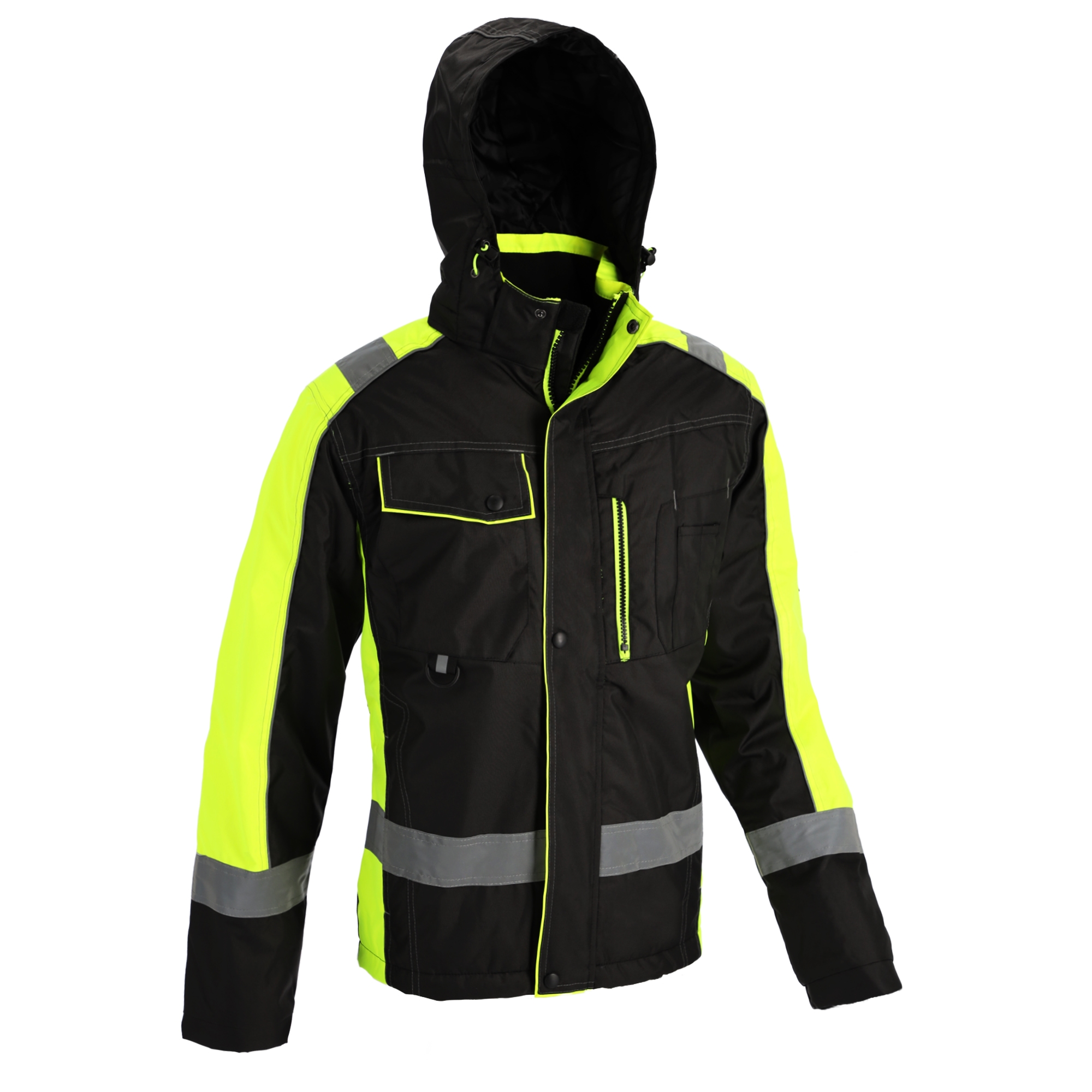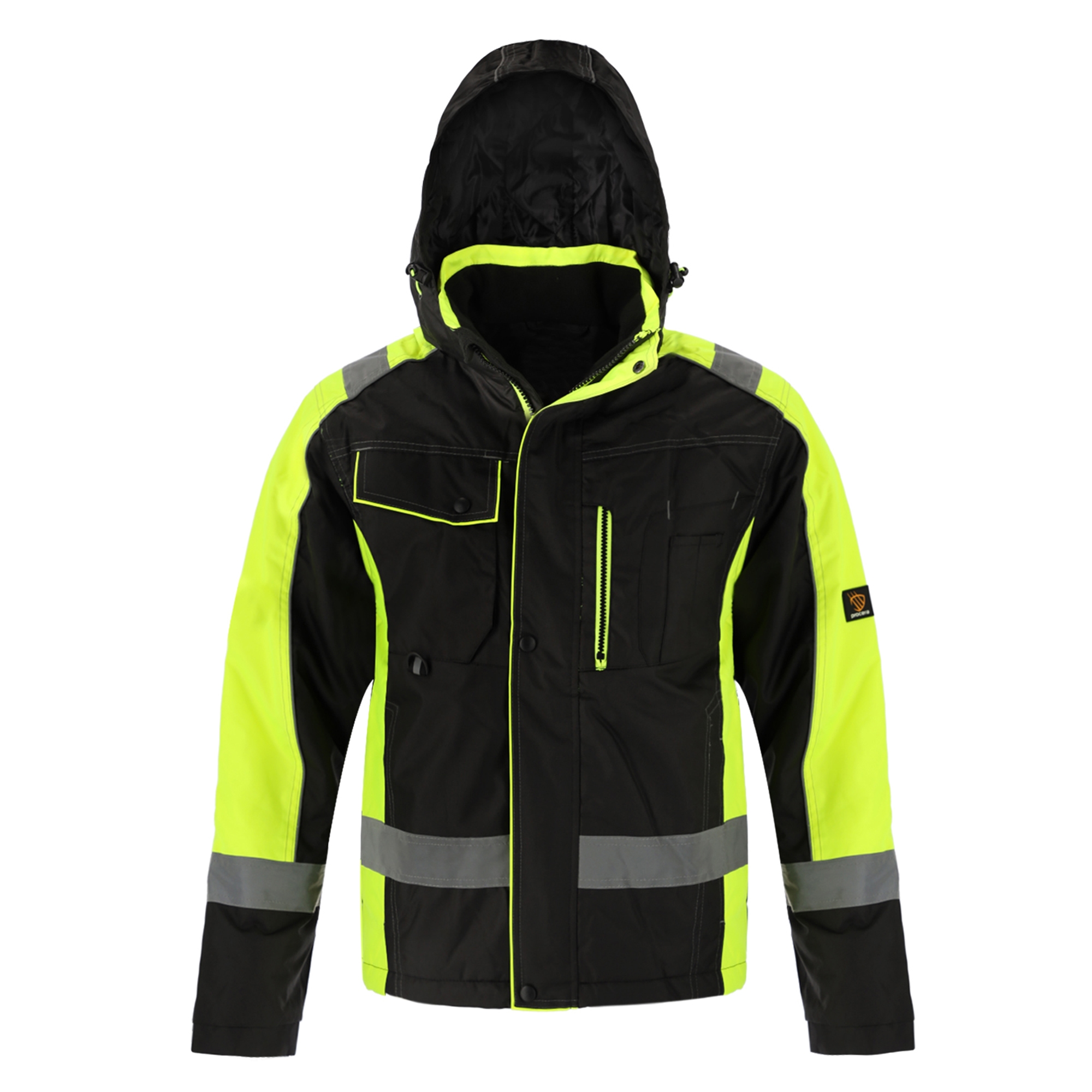 Kurtka ocieplana ALPHA wykonana z wodoodpornego materiału OXFORD (100% poliester impregnowany wewnętrznie PU). Zasuwana na zamek błyskawiczny osłonięty listwą na napy. Wiele funkcjonalnych kieszeni w tym kieszenie zewnętrzne: na klatce piersiowej zapinane na zamek oraz na napy, kieszonki na przybory, dwie dolne kieszenie wsuwane zapinane na zamek oraz kieszenie wewnętrzne: kieszeń siatkowa na akcesoria zimowe, kieszeń na smartfon zapinana na rzep oraz kieszeń piersiowa wewnętrzna na zamek. Taśma odblaskowa na korpusie i rękawach zwiększająca widoczność. Odpinany ocieplany kaptur z elementami odblaskowymi, ze ściągającymi gumkami i stoperami dla pełnej regulacji i najlepszego dopasowania. Wysoki kołnierz chroniący przed wiatrem z wewnętrznym miękkim polarowym obszyciem. Mankiety zakończone miękkim wewnętrznym ściągaczem. Pikowana poliestrowa podszewka. Nieprzemakalne szwy uszczelnione taśmą. (UE) 2016/425 Rozmiary od S-XXXL. Kolory: Czarna/Żółta HV