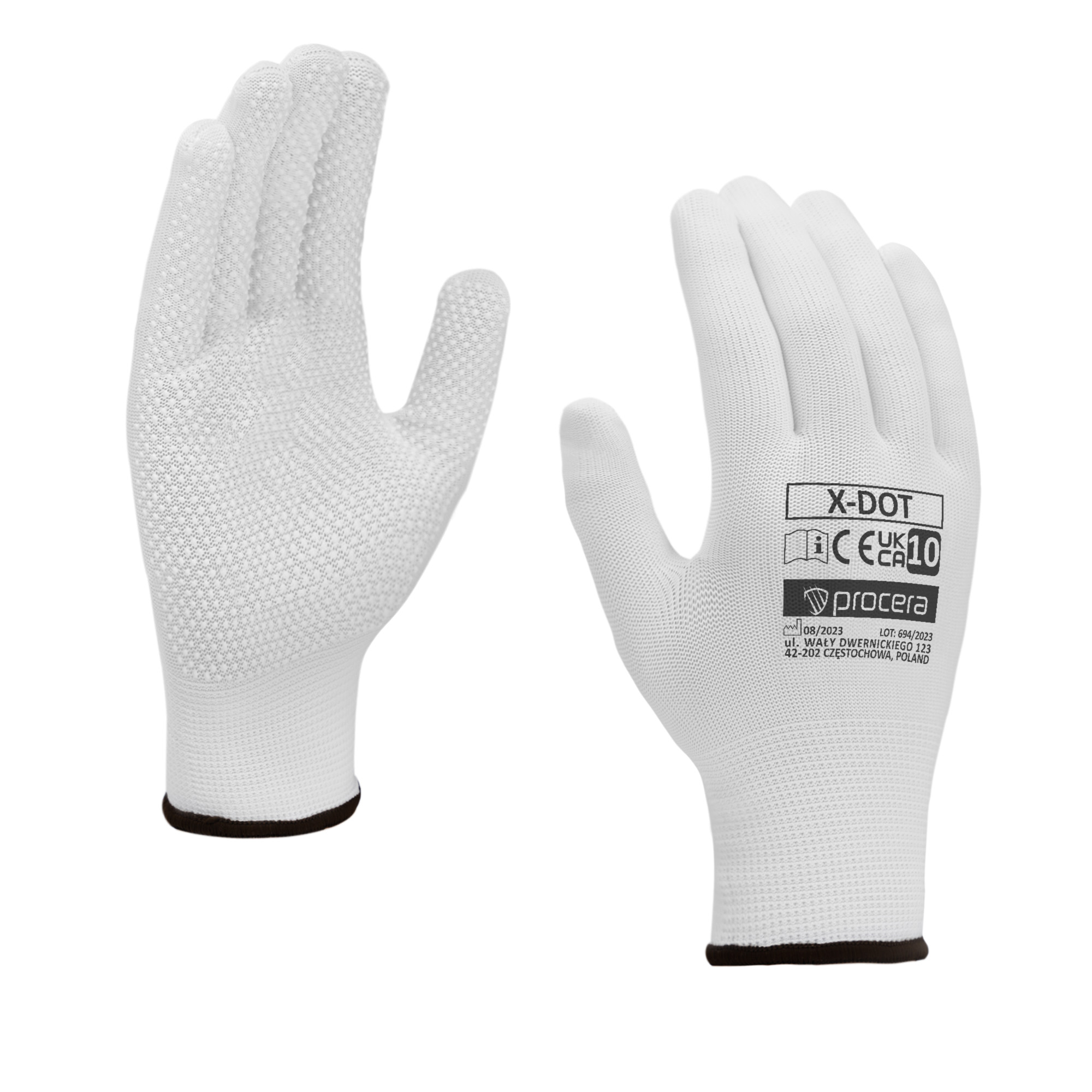 Rękawice X-DOT wykonane z poliestru z jednostronnym mikro nakropieniem w kolorze białym. Idealne do prac manualnych. Bardzo dobre czucie trzymanego przedmiotu. Dobrze dopasowują się do kształtu dłoni. Rozciągliwe i elastyczne. Zakończone ściągaczem. Przeznaczone do prac mechanicznych. CE. Opakowanie: karton 12/300. Kolor: biały.