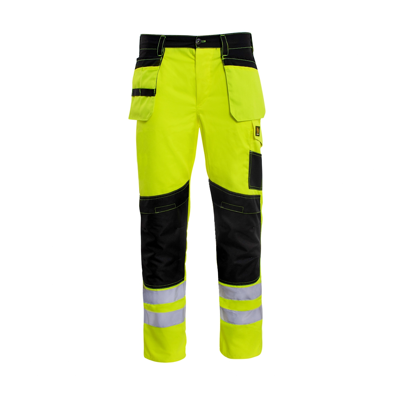 Spodnie do pasa PROMONTER HV. Spodnie wykonane z wytrzymałej na rozdzieranie i tarcie tkaniny typu Twill o składzie 65% poliester i 35% bawełna, o gramaturze 260g/m2. Na kolanach wzmocnienia z materiału typu OXFORD zabezpieczającego przed przetarciem. Możliwość zastosowania wkładek nakolannikowych. Dodatkowe elementy odblaskowe. Duża liczba funkcjonalnych kieszeni w tym dwie zwiększające swobodę ruchów podwójne wiszące kieszenie monterskie z podziałkami i dodatkowymi elementami do zamocowania akcesoriów lub narzędzi, kieszeń na calówkę, kieszeń typu bojówka, dwie kieszenie tylne i dwie kieszenie boczne. Gumy dopasowujące w tylnej części pasa. Dodatkowe wzmocnienia, rygle i podwójne szwy zwiększające wytrzymałość. Wyprodukowano w Polsce zgodnie z ISO 9001. Rozmiary od 48-62. (UE) 2016/425