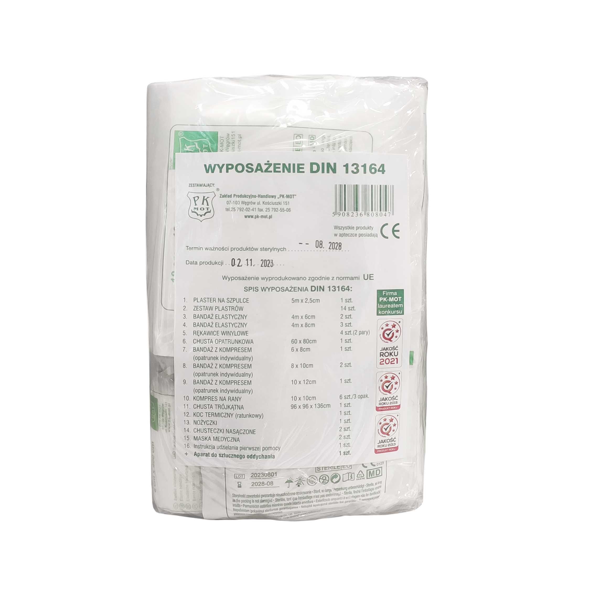 W skład zestawu wchodzi: – Plaster na szpulce 5m x 2,5cm – 1 szt. – Zestaw plastrów – 14 szt. – Bandaż elastyczny 4m x 6cm – 2 szt. – Bandaż elastyczny 4m x 8cm – 3 szt. – Rękawiczki jednorazowe winylowe – 4 szt./ 2 pary – Chusta opatrunkowa 60 x 80cm – 1szt. – Chusta opatrunkowa 60 x 40cm – 1 szt. – Bandaż z kompresem (opatrunek indywidualny) 6 x 8cm – 1 szt. – Bandaż z kompresem (opatrunek indywidualny) 8 x 10cm – 2 szt. – Bandaż z kompresem (opatrunek indywidualny) 10 x 12 cm – 1 szt. – Kompres na rany 10 x 10cm – 6szt./3 opak. – Chusta trójkątna – 2 szt. – Koc termiczny – 1 szt. – Nożyczki – 1 szt. – Chusteczki nasączone – 2szt. – Instrukcja udzielania pierwszej pomocy – 1 szt
