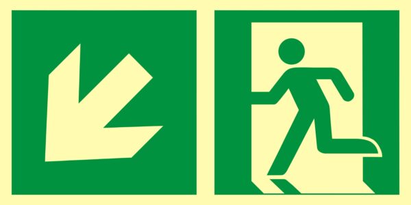 ZNAK EWAKUACYJNY – KIERUNEK DO WYJŚCIA EWAKUACYJNEGO – W DÓŁ W LEWO – AAE 103 CE PS